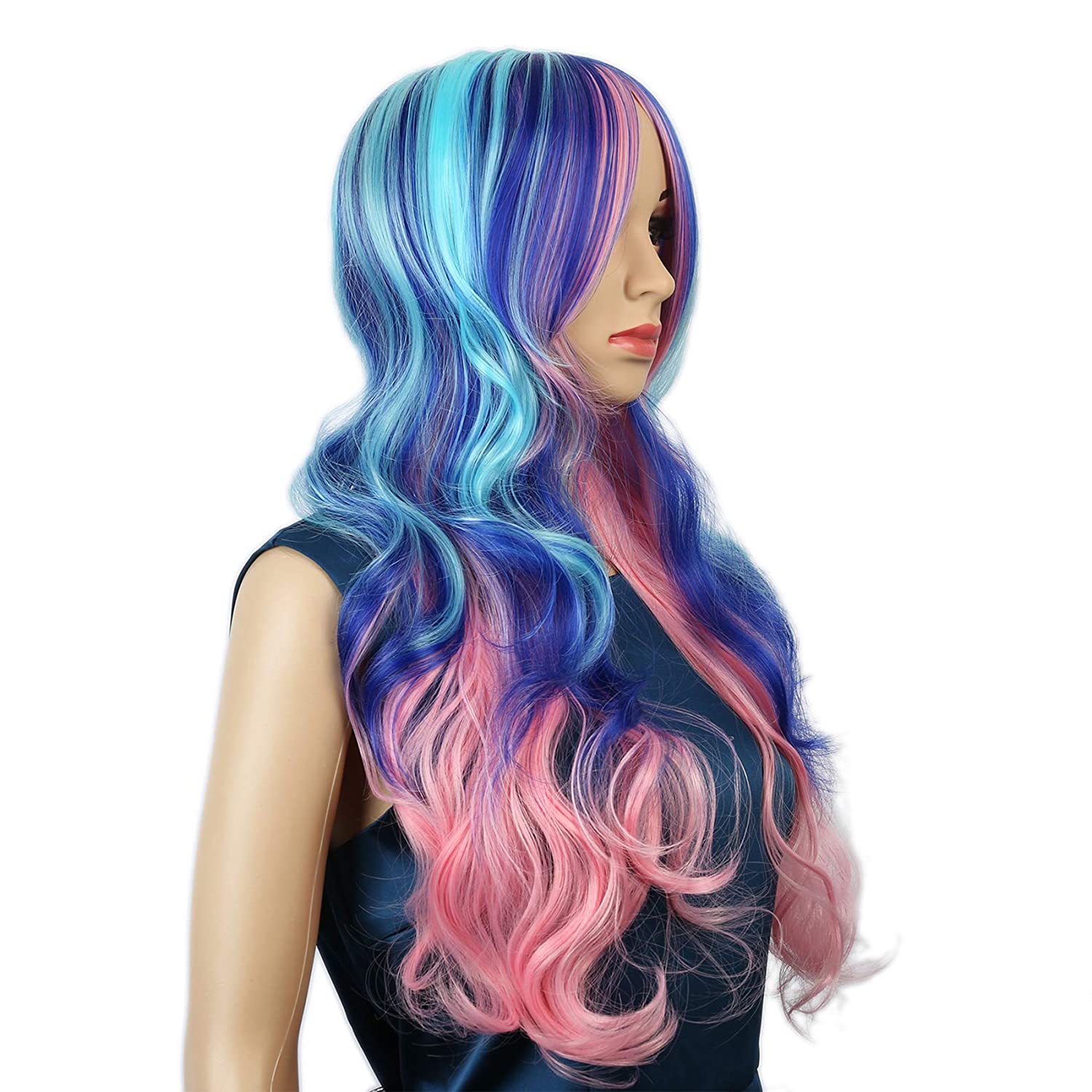 VCKOVCKO Natural Wavy Multi-Color Wig Synthetic Colorful Cosplay Party Wig for Women Girl26"(Light Blue-Blue-Pink)