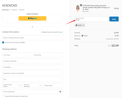 Please find "DISCOUNT CODES" section in shopping cart or order information page, then just enter Coupon Code like "VCKO" ,and click "APPLY " button before you check out.